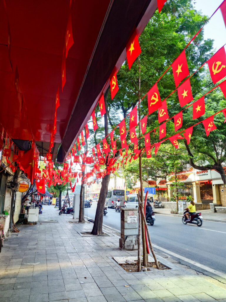 街じゅうに赤地に黄色い星の国旗、共産党のマークが掲げられてる様子が見られます。